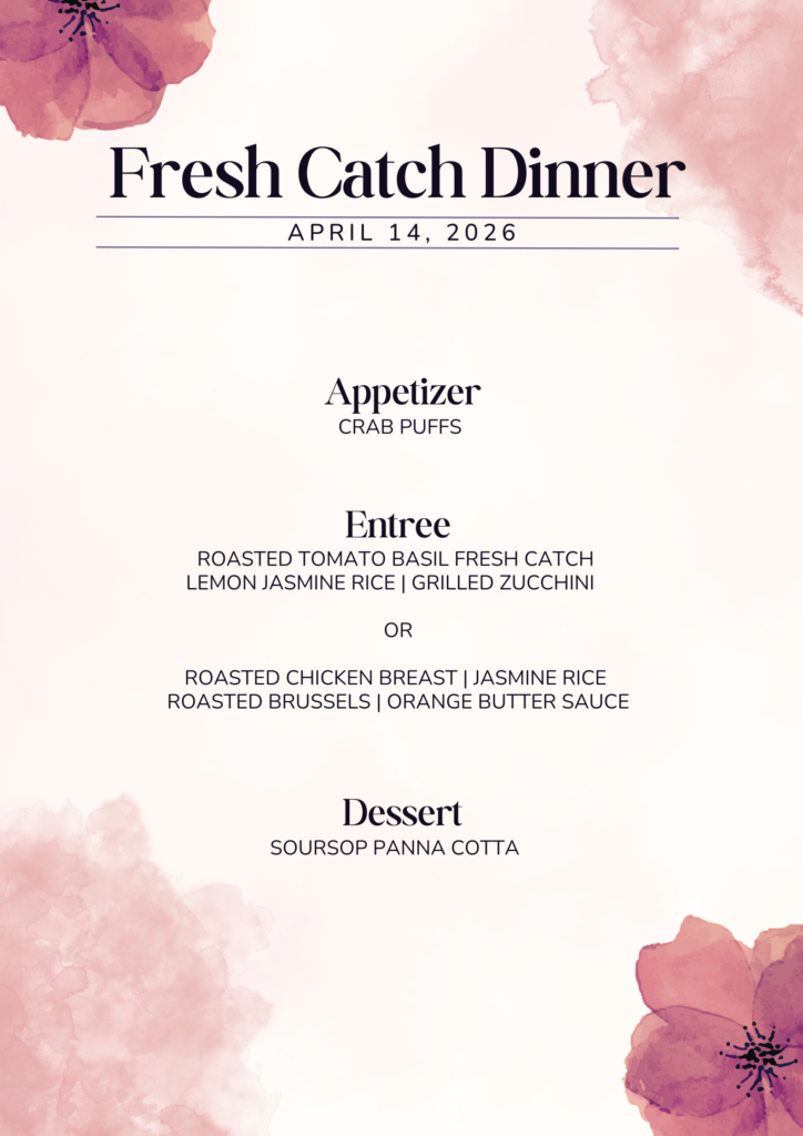 On April 14th, we’re leaning into the kind of meal that doesn’t need much fuss, just good ingredients, handled well. It starts with crab puffs (because why not start strong), then moves into a roasted tomato basil fresh catch with lemon jasmine rice and grilled zucchini; bright, clean, and exactly what you want after a long day.