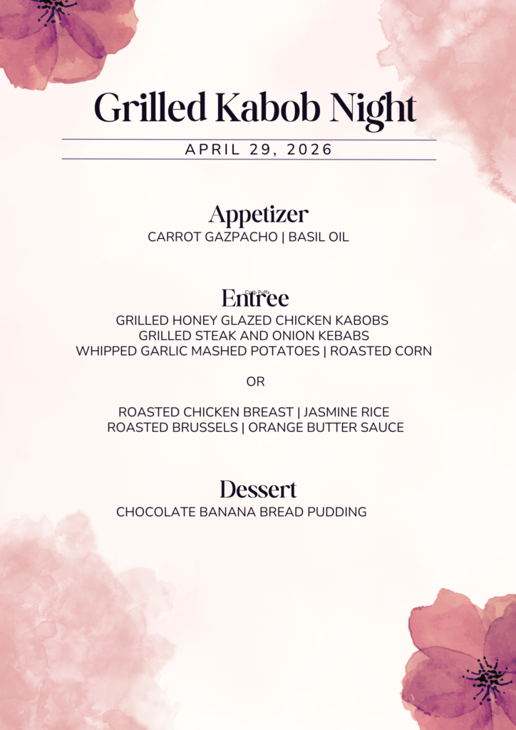 On April 29th, we’re firing up the grill for a night that’s all about smoky, sweet, and straight-off-the-flame flavor. It starts light with a chilled carrot gazpacho finished with basil oil, then moves into grilled honey glazed chicken kabobs and steak with onions, simple, satisfying, and just right for an evening outside.